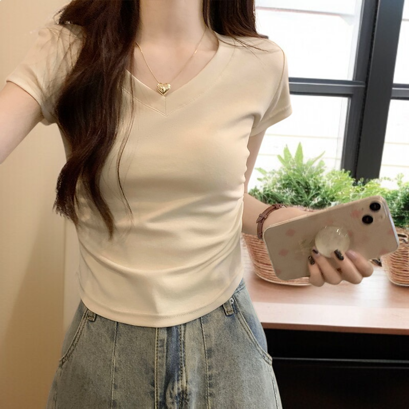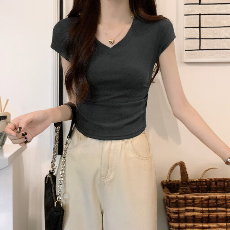 レディース半袖アイスシルクカラーボーンシックプリーツ半袖Tシャツトップス