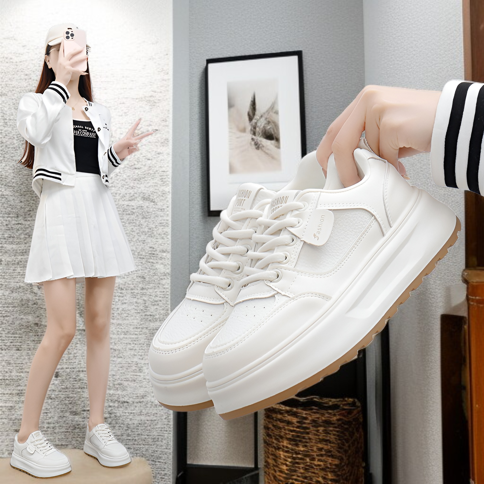 2025春新作白い韓国風厚底カジュアルスニーカー
